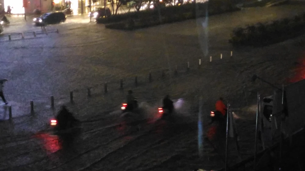 Vũ lượng mưa đo được ở trạm Lý Thường Kiệt (Tân Bình) lên đến hơn 135 mm, lớn nhất trong nhiều năm qua. “Hiện chưa có số liệu đối chiếu cụ thể nhưng có thể nói đây là trận mưa lớn nhất trong vòng nhiều năm trở lại đây, ít nhất là trong vòng năm năm” - lãnh đạo Công ty Thoát nước đô thị cho biết. Trong ảnh: Ngập tại phố đi bộ Nguyễn Huệ.