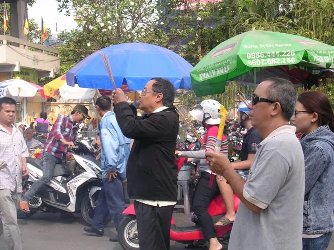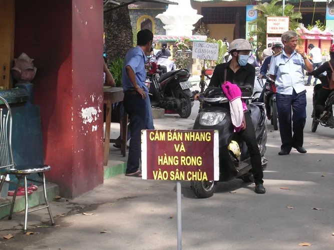 Trước cổng nhiều chùa, người bày biện các mặt hàng như nhang, đèn, chim phóng sanh, hoa sen với giá đắt hơn ngày thường để bán cho các du khách. Tại chùa Vĩnh Nghiêm (Q.3), chúng tôi bắt gặp những cảnh chèn kéo, mời gọi khách mua nhang đèn.