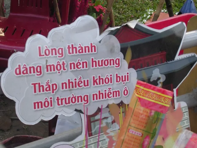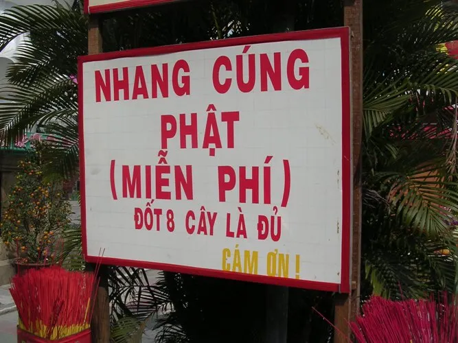 Thông báo không nên mua nhang từ bên ngoài được đặt trước cổng Việt Nam Quốc Tự.