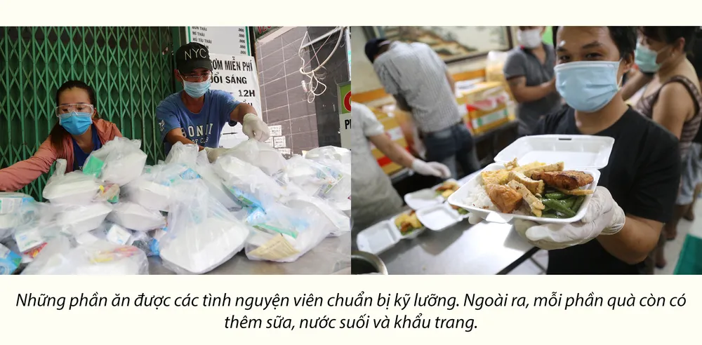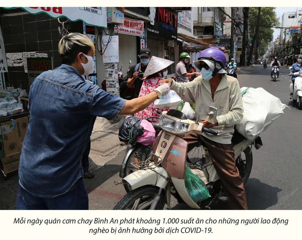 Loay hoay phân chia cơm chay thành từng bịch nhỏ, bà Đoàn Thị Ánh Tuyết (75 tuổi, ngụ quận 10) chia sẻ: “Ý tưởng thực hiện quán cơm là từ khi Chính phủ có lệnh ngưng hoạt động với người bán vé số trong vòng 15 ngày. 15 ngày đó, những anh bán vé số, những người lao động ở lòng lề đường lấy gì họ ăn? Ai giúp họ trong lúc cơ nhỡ này? Vì thế, tôi cùng nhiều người sống gần đây đến quán cơm Bình An để hỗ trợ, giúp chuyển những phần quà đến tay người đang cần”.