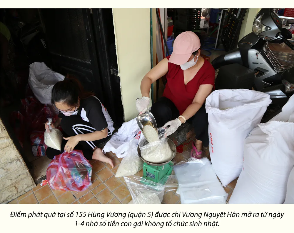 Ở 155 Hùng Vương (phường 4, quận 5), một điểm phát quà cũng được mở từ đầu tháng 4, đã hỗ trợ khoảng 2.000 suất quà cho những người khó khăn trong vòng bốn ngày thực hiện. Đây là điểm phát quà do chị Vương Nguyệt Hân mở ra với hy vọng giúp đỡ được nhiều hoàn cảnh khó khăn trong mùa dịch.