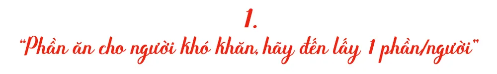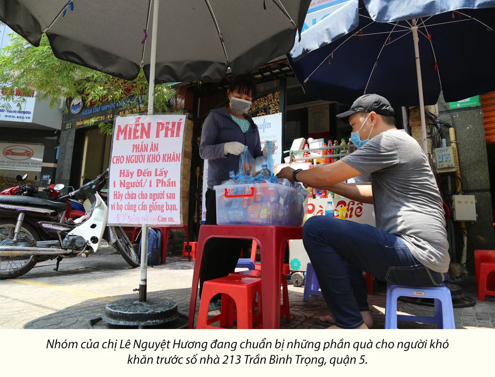Trước nhà 213 Trần Bình Trọng (quận 5), một tấm biển với nội dung “Phần ăn cho người khó khăn, hãy đến lấy 1 phần/người. Hãy chừa cho người sau vì họ cũng cần giống bạn” được đặt ngay ngắn trên vỉa hè. Cạnh đó, ba người đang loay hoay sắp xếp từng phần quà để sẵn, chờ người đang thật sự cần chúng đến nhận.