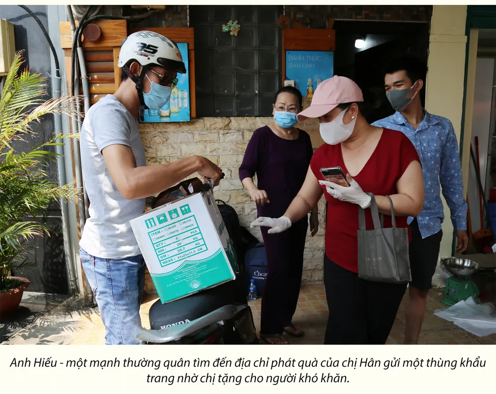 Chị Hân cho biết ngày 31-3 là sinh nhật con gái nhưng bé không tổ chức mà để dành tiền mua quà phát cho người nghèo. Vậy nên chị cùng người nhà chuẩn bị mỗi phần gồm 2 kg gạo, năm gói mì, khẩu trang, hai gói cháo và sữa. “Hôm đó tôi chuẩn bị khoảng 150 phần. Trong ba ngày tôi đã phát đi 2 tấn gạo” - chị Hân nói.