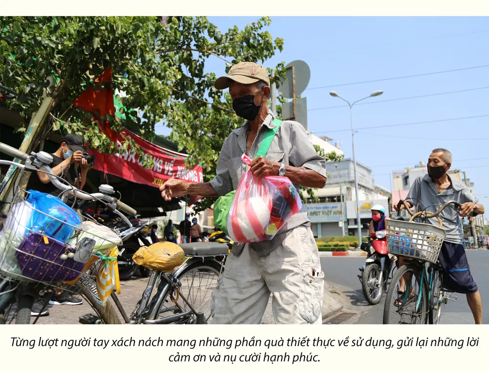 Dưới cái nắng gắt giữa trưa, đường phố Sài Gòn vắng lặng khi người dân thực hiện theo Chỉ thị cách ly xã hội. Thế nhưng đâu đó ở nhiều tuyến đường, từng lượt người tay xách nách mang những phần quà thiết thực về sử dụng, gửi lại những lời cám ơn và nụ cười hạnh phúc.