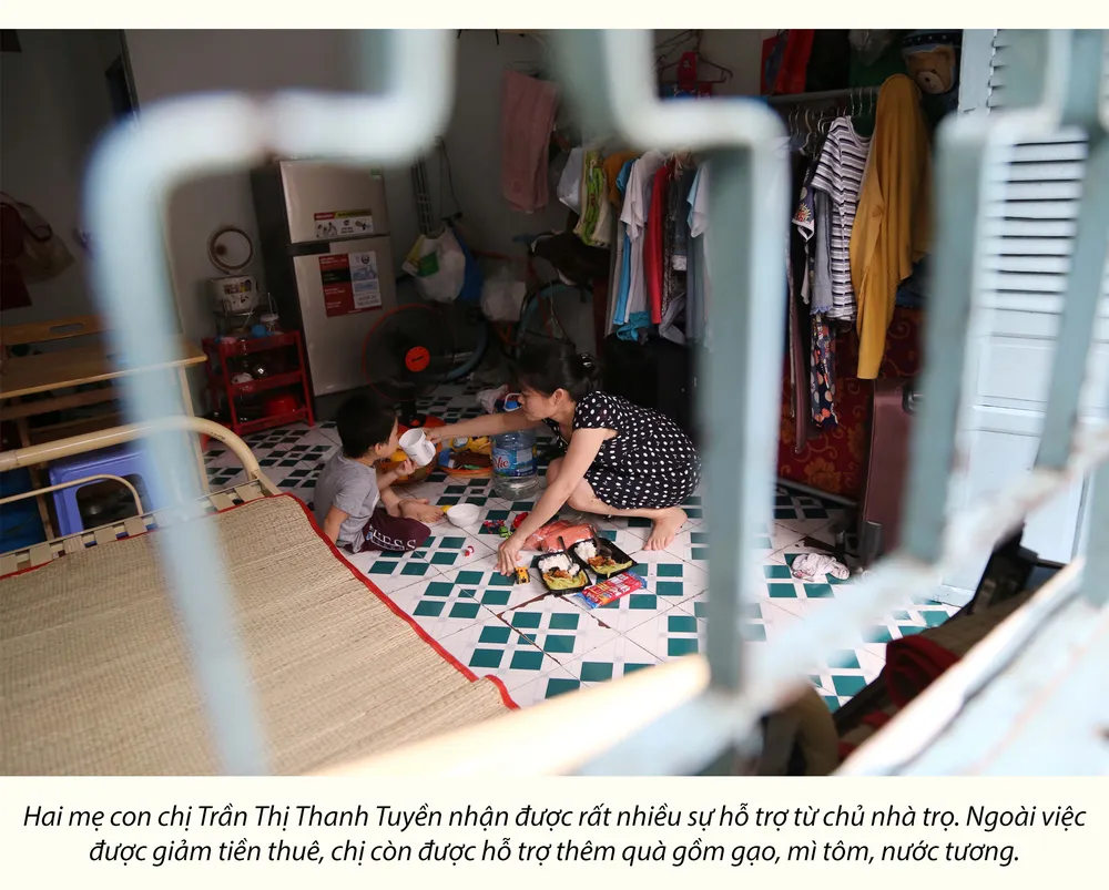 Vừa nhận cơm từ chủ phòng trọ về phòng chuẩn bị ăn trưa, chị Trần Thị Thanh Tuyền kể chị cũng được công ty cho nghỉ ở nhà vì dịch bệnh. Cuộc sống chỉ có hai mẹ con đùm bọc lẫn nhau, khi phải nghỉ làm ở nhà, chị lo lắng không biết sẽ lấy gì để xoay xở cho cuộc sống. May mắn được chủ nhà trọ giảm tiền thuê, được hỗ trợ thêm quà gồm gạo, mì tôm, nước tương, cơm...