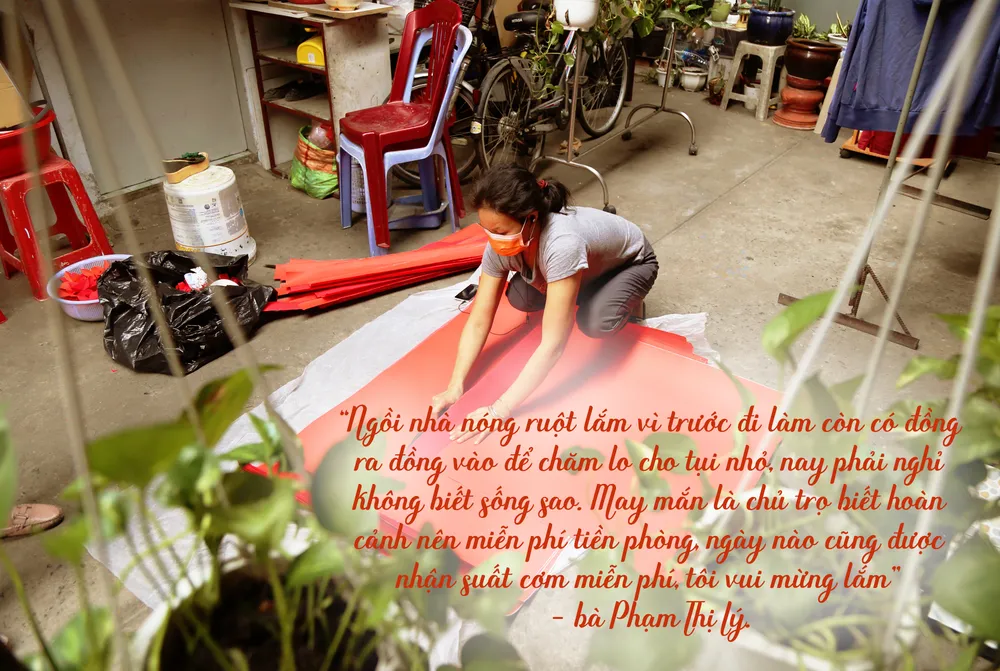 Bà Phạm Thị Lý (người thuê trọ) cho biết từ khi có Chỉ thị cách ly xã hội, bà phải tạm ngưng nhặt ve chai. Không kiếm ra tiền, bà cùng hai con đang rất lo lắng thì nhận được hỗ trợ từ chủ nhà trọ. “Ngồi nhà nóng ruột lắm vì trước đi làm còn có đồng ra đồng vào để chăm lo cho tụi nhỏ, nay phải nghỉ không biết sống sao. May mắn là chủ trọ biết hoàn cảnh nên miễn phí tiền phòng, ngày nào cũng được nhận suất cơm miễn phí, tôi mừng lắm” - bà Lý chia sẻ.
