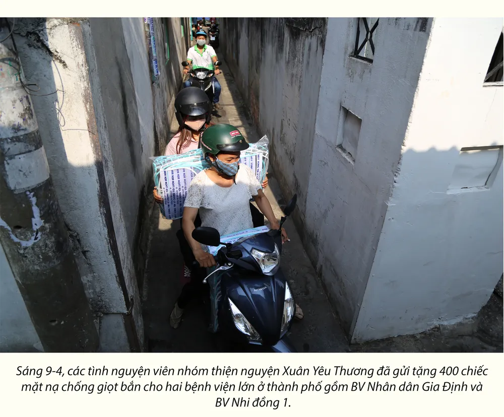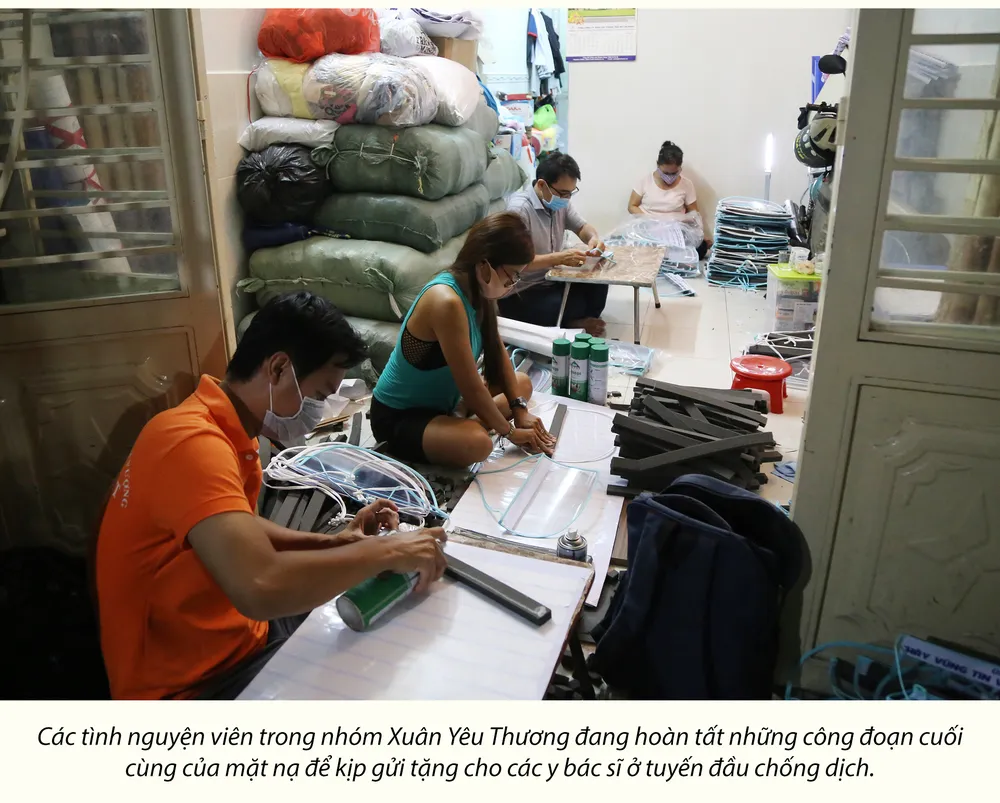 23 giờ ngày 8-4, trong một con hẻm trên đường Nguyễn Công Hoan (quận Phú Nhuận, TP.HCM), các tình nguyện viên nhóm thiện nguyện Xuân Yêu Thương vẫn đang tất bật chuẩn bị những chiếc mặt nạ ngăn giọt bắn phòng COVID-19 để kịp gửi tặng các y, bác sĩ vào sáng sớm hôm sau.
