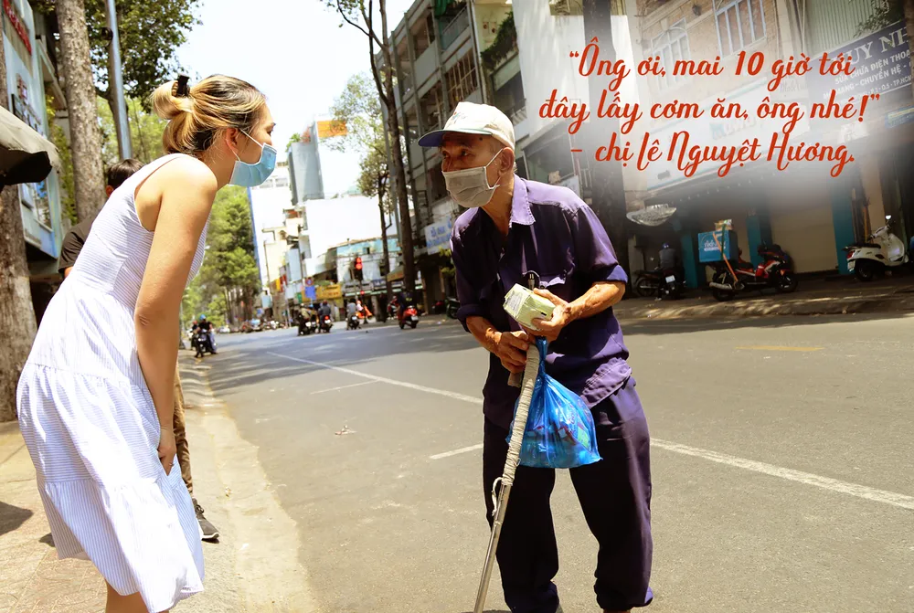 Chị Lê Nguyệt Hương cầm trên tay những gói quà nhỏ, bên trong có một ít mì gói, nước suối. Thấy từ xa một người đàn ông già yếu, tay chống gậy đang bước tới, chị vội chạy đến trao tận tay cho ông. “Ông ơi, mai 10 giờ tới đây lấy cơm ăn, ông nhé!” - chị nói thêm.