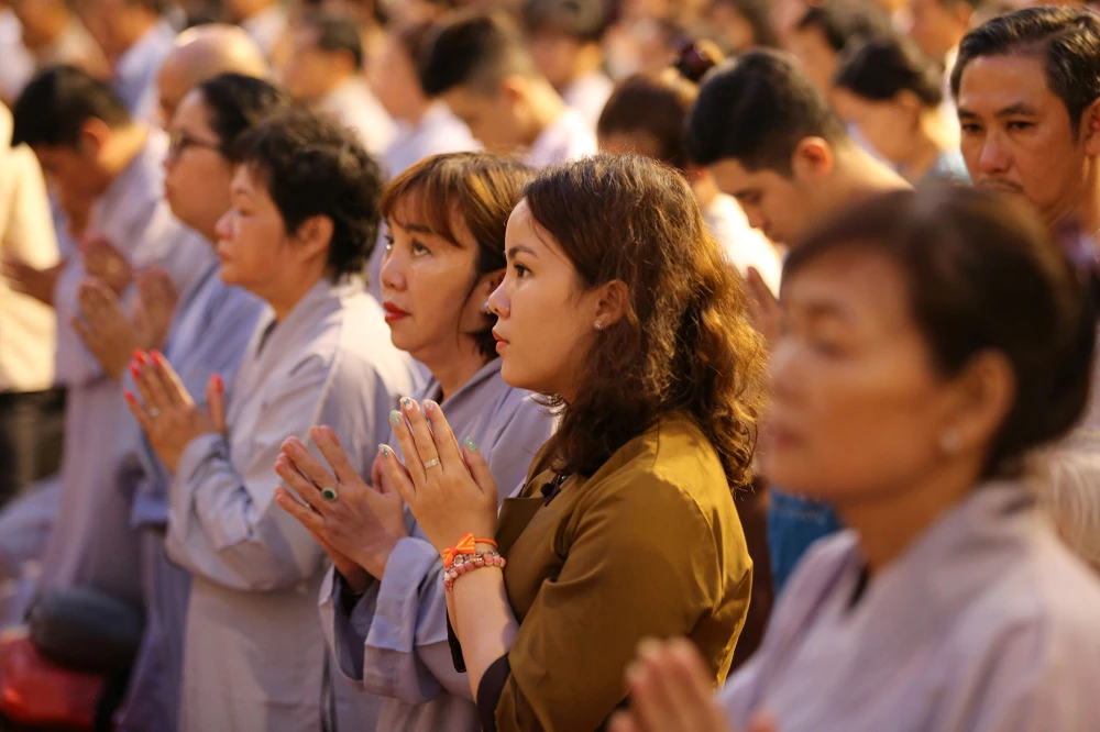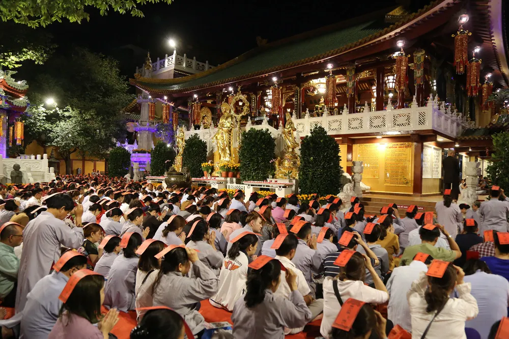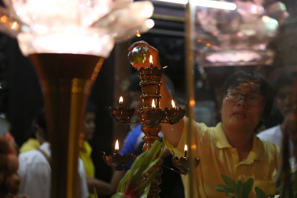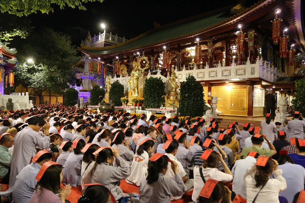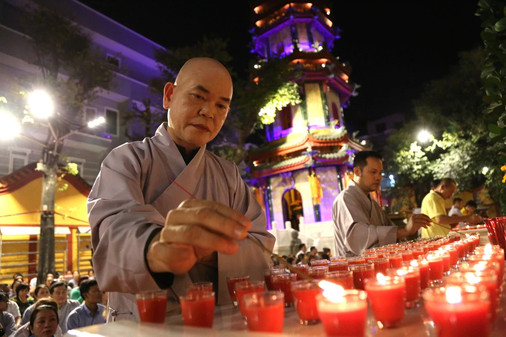 Từ 17 giờ, khuôn viên và chánh điện chùa Viên Giác (quận Tân Bình) chật kín phật tử đến cầu an đầu năm.