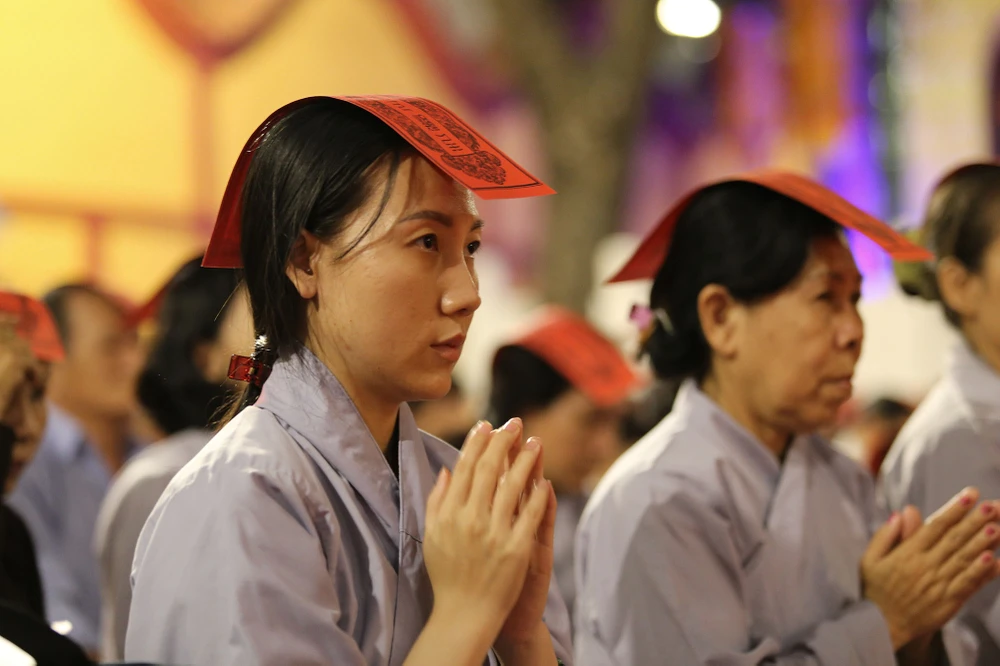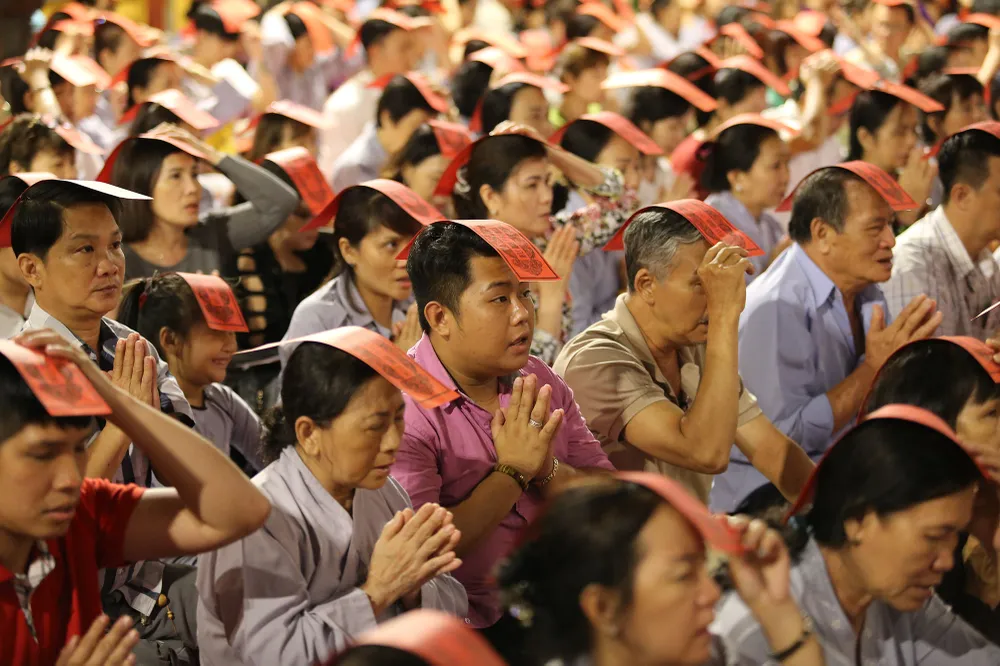 Hàng trăm người ngồi bên ngoài chánh điện chùa Viên Giác đội sớ, vái vọng vào trong, lẩm bẩm khấn theo lời của sư trụ trì.