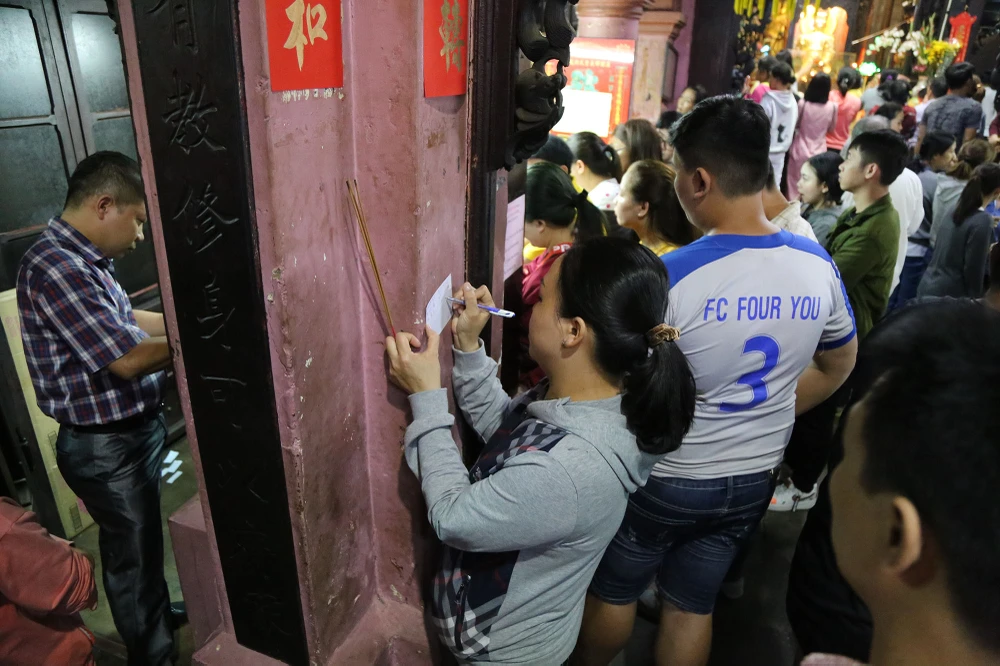 Khuôn viên chùa đông nghẹt, nhiều người tranh thủ những khoảng trống để ghi danh sách cầu an.