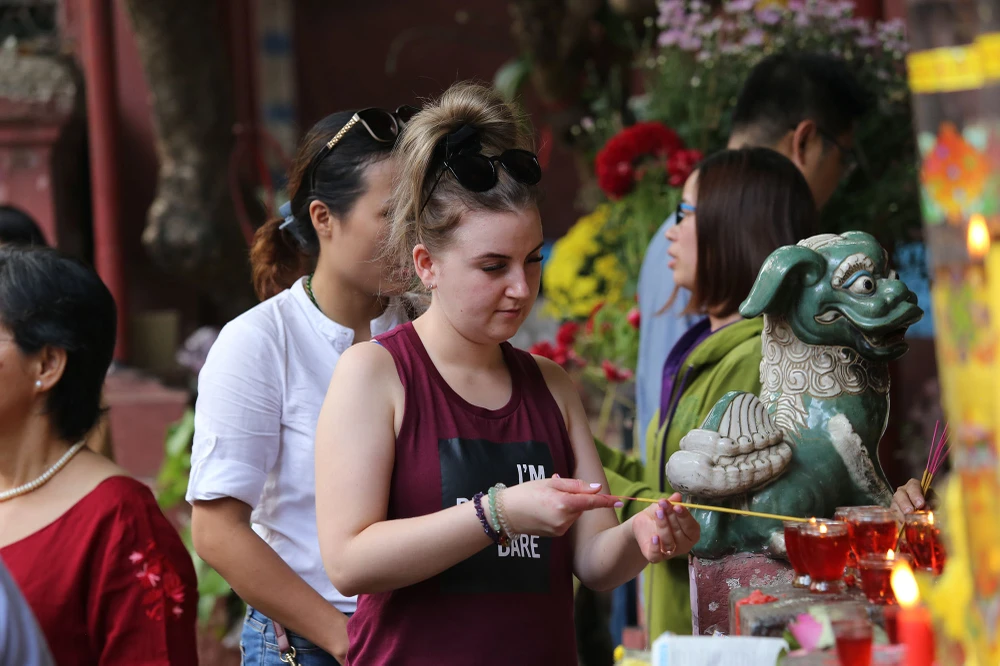 Khách nước ngoài đi lễ chùa Ngọc Hoàng trong năm mới.