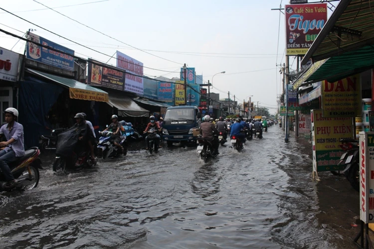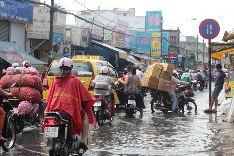 Sau những ngày nắng nóng gay gắt, khoảng 15 giờ 30 chiều 16-5, một cơn mưa như trút nước đã đổ xuống địa bàn các quận Tân Bình, Gò Vấp, Q.12... Tuy chỉ kéo dài gần 1 giờ nhưng cơn mưa khá nặng hạt đã khiến nhiều tuyến đường chìm trong biển nước.