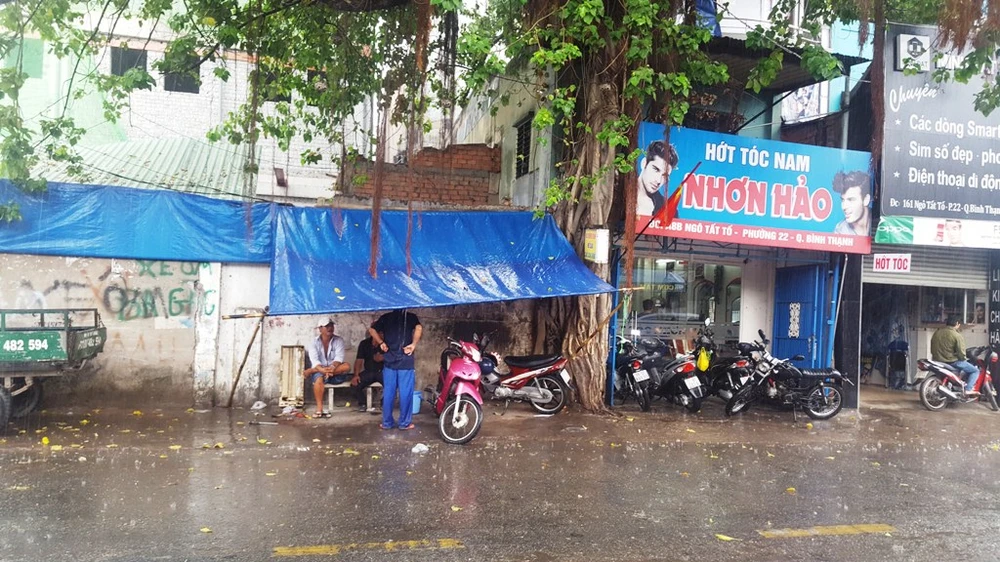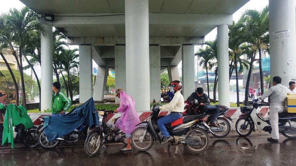 Gầm cầu vượt đường Nguyễn Hữu Cảnh, quận 1 bỗng trở thành nơi trú mưa.