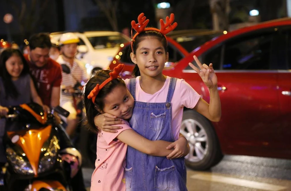 Các em nhỏ thích thú chụp ảnh cùng ông già Noel trên đường Hai Bà Trưng (quận 1).