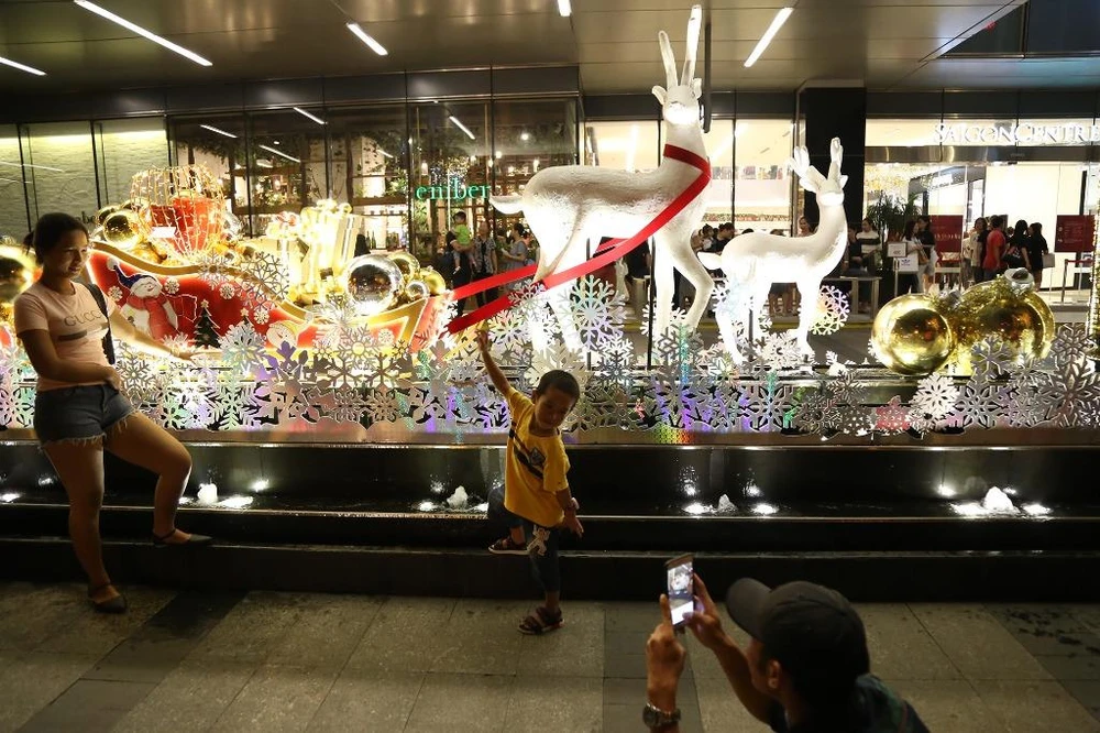 Bé trai thích thú tạo dáng cùng mẹ bên cạnh hình ảnh đàn tuần lộc kéo ông già Noel đi phát quà tại một trung tâm thương mại trên đường Pasteur (quận 1).