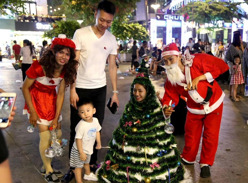 Nhiều bạn trẻ hóa thân thành ông già Noel, cây thông cho khách chụp ảnh trên phố đi bộ Nguyễn Huệ (quận 1).