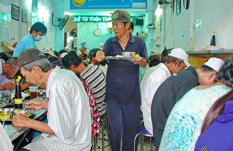 Nhà báo Nam Đồng (nguyên Tổng Biên tập báo Pháp Luật TP.HCM) và nhiều nhà hảo tâm khác đã giúp người nghèo có được bữa ăn ngon với giá chỉ 2.000 đồng ở hệ thống quán cơm xã hội Nụ Cười. Ảnh: T.MẬN
