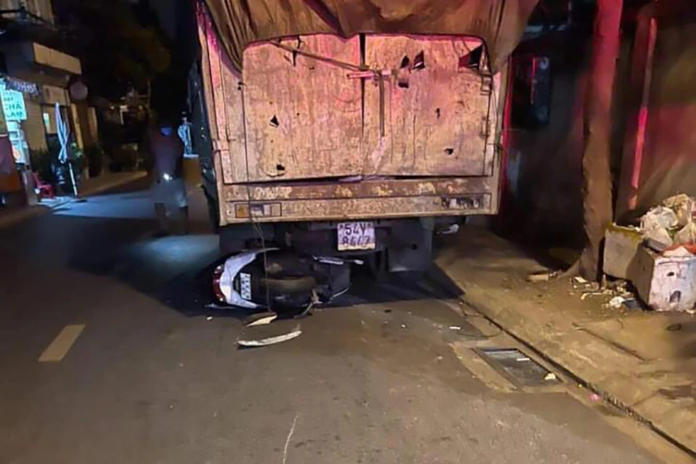 Chiếc xe máy do anh H điều khiển tông trúng đuôi xe tải đang dừng đỗ bên đường. Ảnh: NDCC