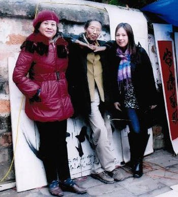 Văn Thùy (giữa) đứng trước những bức thư pháp của ông.