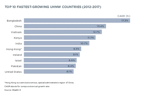 Tính trong giai đoạn 2012-2017, trong nhóm 10 nước có tốc độ tăng trưởng bình quân hằng năm về giới siêu giàu thì Việt Nam đứng thứ ba thế giới với tốc độ tăng trưởng là 12,7%/năm, chỉ xếp sau Bangladesh, Trung Quốc và đứng trên cả Mỹ, Hong Kong, Ấn Độ. Như vậy mỗi năm số người có tài sản từ 30 triệu USD trở lên tại Việt Nam tăng gần 13%.