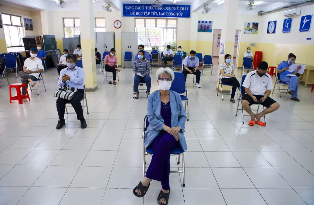 Ghi nhận trong ngày 10-10, tại điểm cấp căn cước công dân (CCCD) tại trường tiểu học Cao Bá Quát, phường 5, quận Phú Nhuận, người dân đến làm CCCD được bố trí ghế ngồi giãn cách để đảm bảo các yêu cầu về phòng dịch.