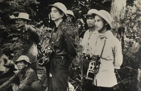 Ông Dũng (bìa phải) với chiếc máy ảnh Roekyplex quen thuộc phục vụ cho việc làm căn cước giả trong căn cứ khoảng năm 1961. Ảnh: Nhân vật cung cấp