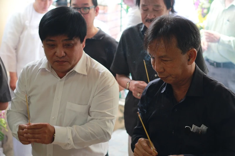 Tổng Biên tập báo Tuổi Trẻ - ông Lê Thế Chữ (bên trái) và Tổng Biên tập báo Thanh Niên - ông Nguyễn Quang Thông đến viếng nhạc sĩ. Ảnh: NHẬT TIẾN