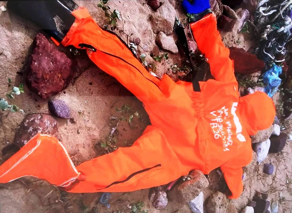 Bộ quần áo bảo hộ tàu VTB26 phát hiện tại bờ biển Nghệ An chiều 19-7.