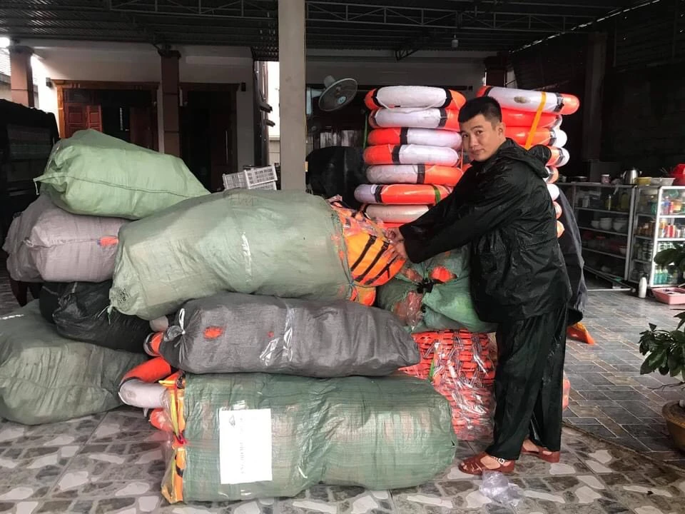 Thầy Chính cùng với một số người bạn mượn thuyền của người dân xã Cảnh Dương (huyện Quảng Trạch) chở nhu yếu phẩm đem vào cho bà con vùng lũ.