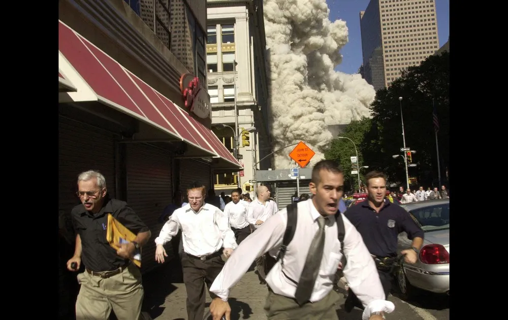 Ông Cooper (ngoài cùng bên trái) trong bức ảnh nổi tiếng về vụ sập tòa tháp đôi Trung tâm Thương mại Thế giới ở New York vào ngày 11-9-2001. Ảnh: AP