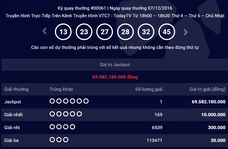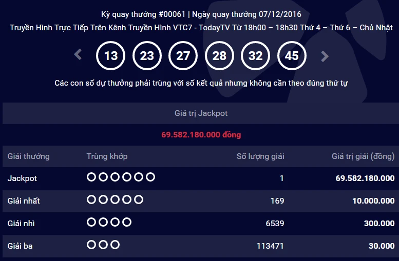 Theo đó, tại kỳ quay thưởng số 61 tối 7-12, Vietlott đã xác định có một vé trúng giải Jackpot (độc đắc) với giá trị giải thưởng 69,58 tỉ đồng. Dãy số may mắn là 13-23-27-28-32-45.