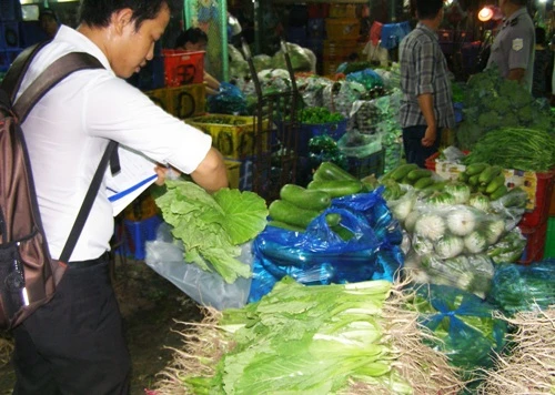 Chi cục Bảo vệ thực vật TP.HCM lấy mẫu rau tại chợ đầu mối Thủ Đức để phân tích thuốc trừ sâu. Ảnh: TRẦN NGỌC