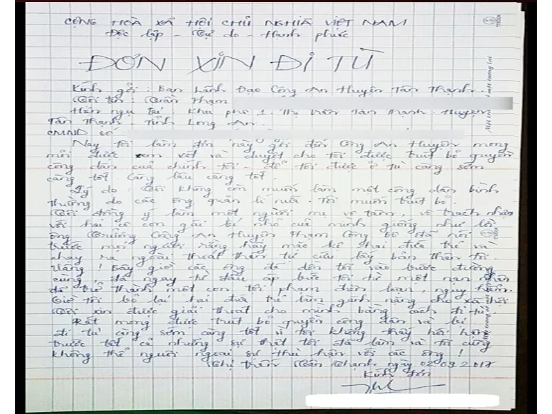 Bức xúc, bà L. đã viết ‘đơn xin đi tù’ với mong mỏi được trút bỏ quyền công dân, được đi tù càng sớm càng tốt, càng lâu càng tốt...