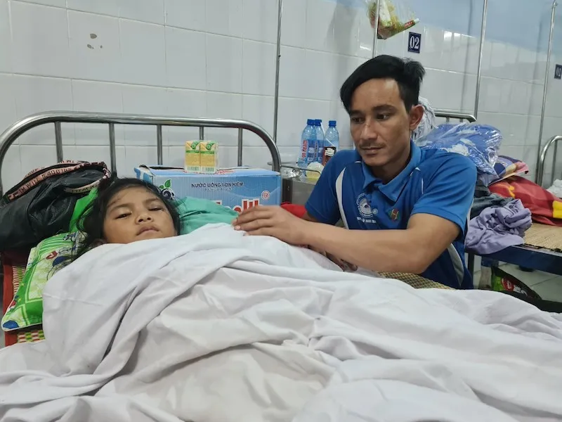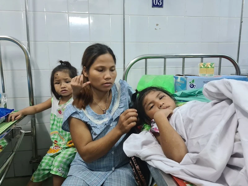 Vợ anh Tùng là chị Hồ Thị Hà đang chăm các con tại bệnh viện. Ảnh: TN