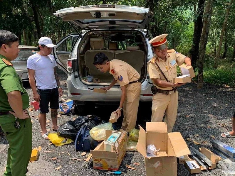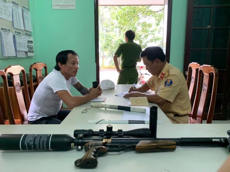 Qua kiểm tra ô tô bảy chỗ, tổ CSGT phát hiện một khẩu súng dạng súng hơi đã sử dụng, một bình xịt hơi cay, một roi điện, sáu bộ linh kiện súng hơi chưa lắp ráp...