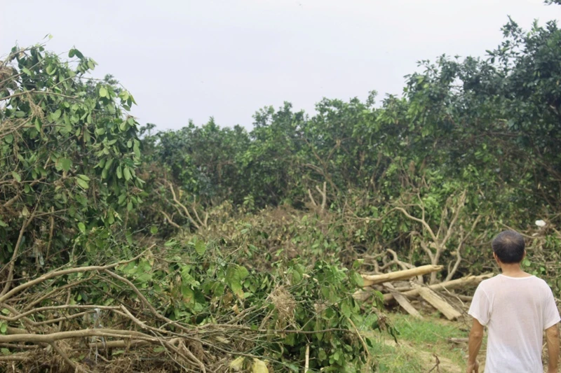 Đứng trong vườn bưởi hoang tàn, bà Hán Thị Hường (45 tuổi, ở thôn Phú Lễ) cùng với con gái lớn đang loay hoay chặt bỏ những cây bị gãy đổ.