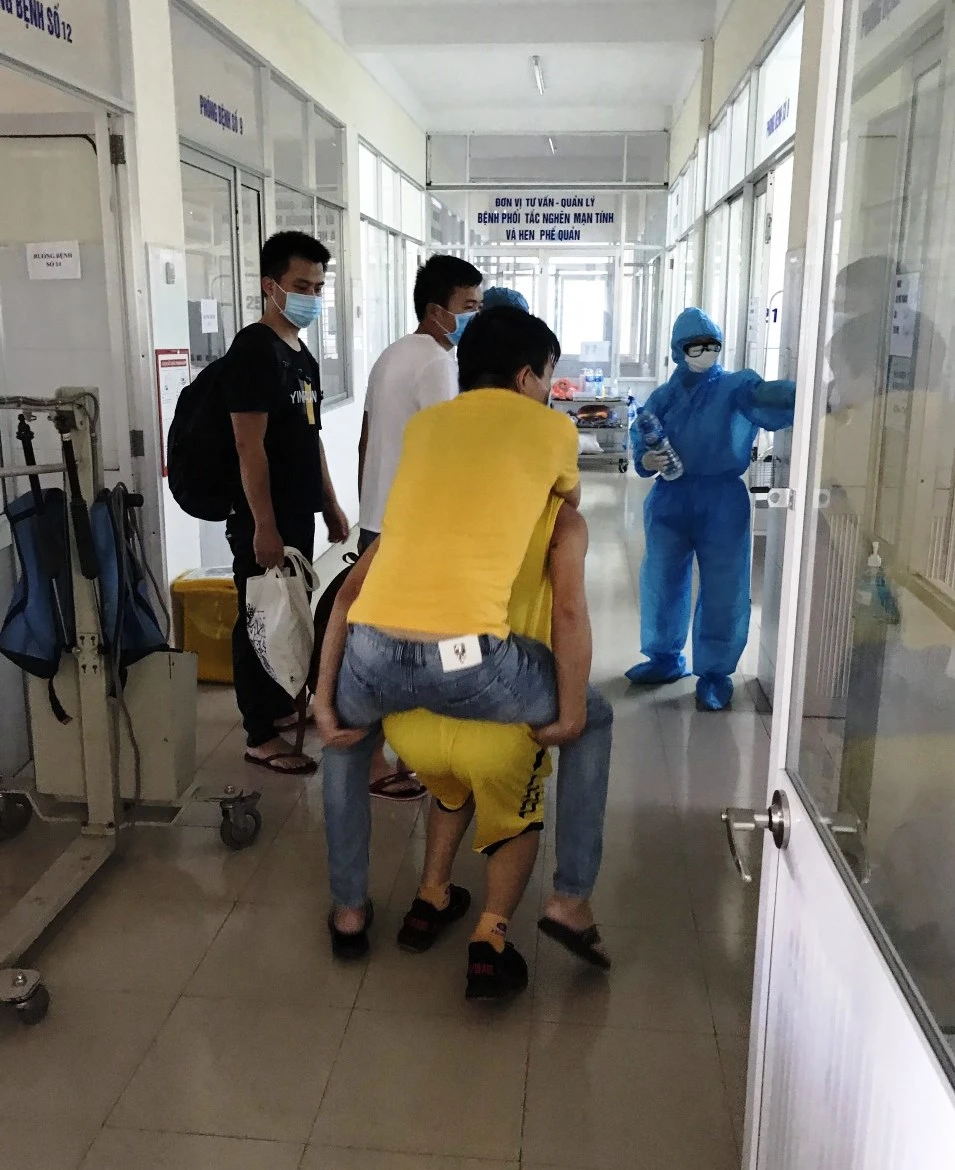 Đồng hương của Chen Xian Fa cõng anh ta vào khu cách ly. Ảnh: C.A