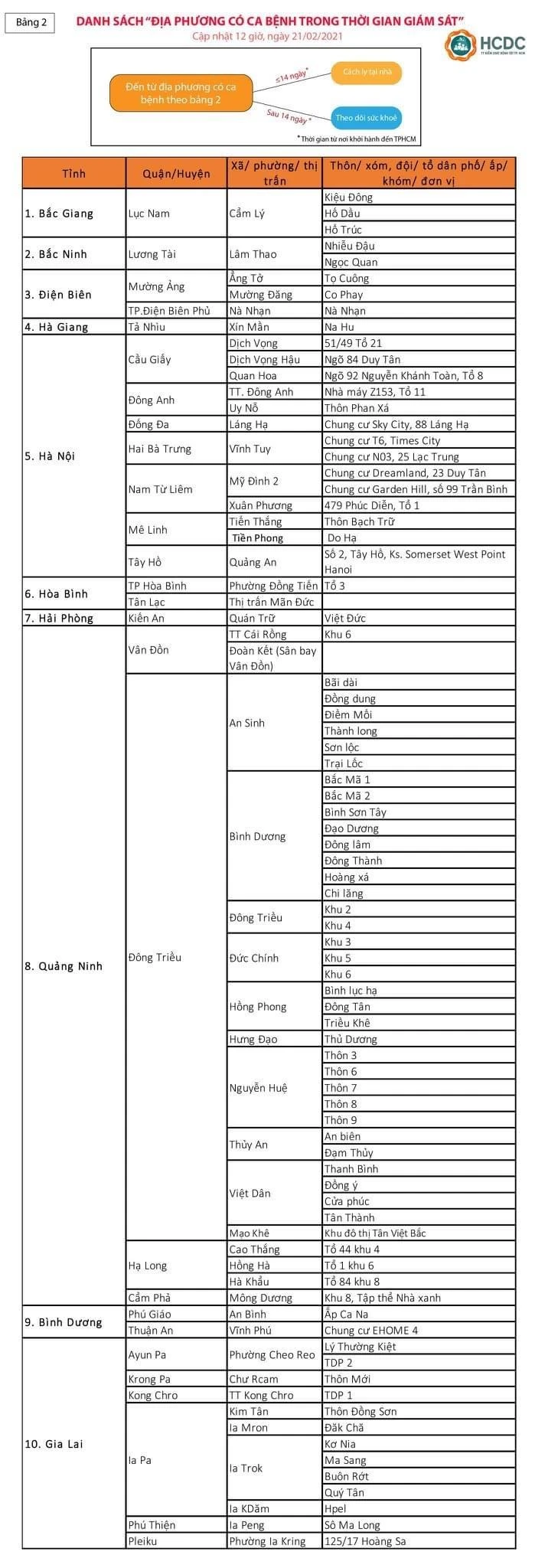 Danh sách địa phương có ca bệnh COVID-19 ở các địa phương, bao gồm Quảng Ninh. Ảnh: HCDC