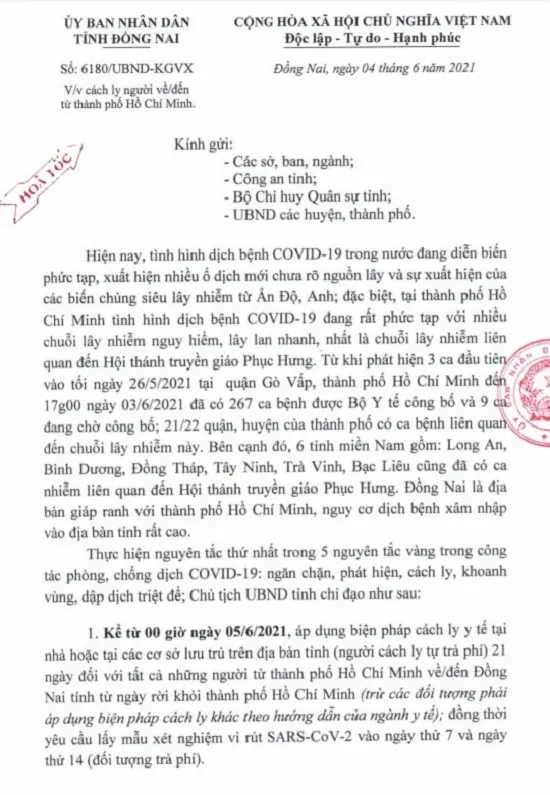Ngày 4-6, UBND tỉnh Đồng Nai có văn bản hỏa tốc về việc cách ly những người từ TP.HCM về Đồng Nai.