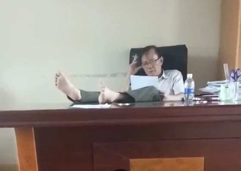Như PLO đã đưa tin, trước đó trên mạng xã hội xuất hiện clip một người đàn ông vừa hut thuốc vừa gác hai chân lên bàn trong giờ làm việc. Clip gây xôn xao, nhiều người cho rằng hành động như vậy là phản cảm, nhất là đối với cán bộ đang làm việc tại cơ quan, đơn vị.