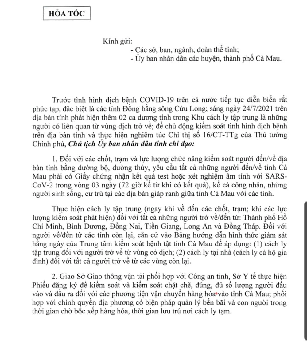 Theo đó, tất cả những người đến/về tỉnh Cà Mau phải có giấy chứng nhận kết quả test nhanh hoặc xét nghiệm âm tính với SARS- CoV-2 trong vòng 3 ngày kể từ khi có kết quả, kể cả công nhân, những người sinh sống, cư trú tại các địa bàn giáp ranh giữa tỉnh Cà Mau với các tỉnh.