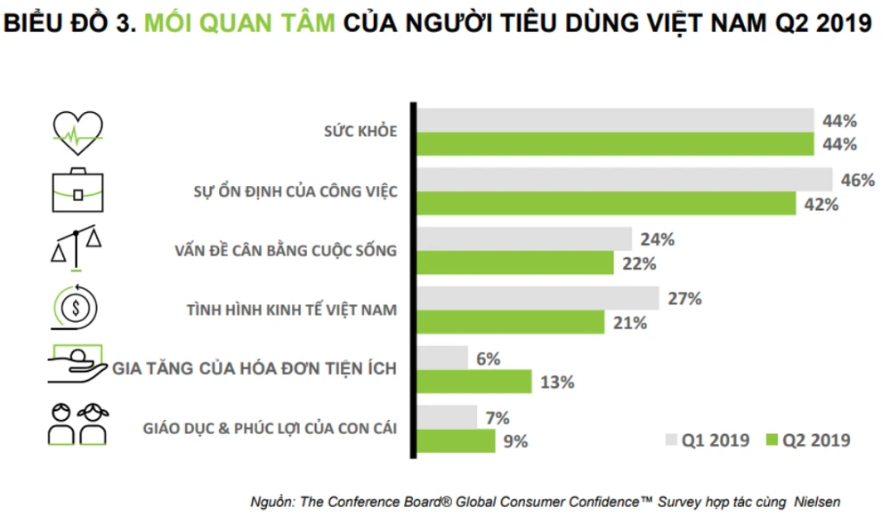 Trong quý II-2019, người tiêu dùng Việt Nam tiếp tục xếp hạng sức khỏe (44%, tương đương với Q1 2019) và sự ổn định của công việc (42%, giảm 4% so với Q1 2019) là hai mối quan tâm hàng đầu của họ, 22% đáp viên chỉ ra rằng vấn đề cân bằng cuộc sống (22%, giảm 2% so với Q1 2019) là yếu tố quan trọng thứ ba.