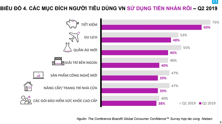 Ngoài ra, các cuộc khảo sát dành cho người Việt Nam đã chỉ ra họ đã bớt các khoản chi tiêu cho quần áo mới (giảm 9%) và các hoạt động giải trí bên ngoài (giảm 6%), sản phẩm công nghệ mới (giảm 8%) và nâng cấp/trang trí nhà cửa (giảm 8%) so với quý trước.