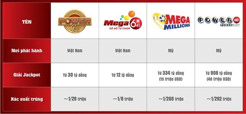 Dưới đây là bảng so sánh cụ thể về giá trị giải thưởng cũng như xác suất trúng thưởng của xổ số tự chọn Mega 6/45 và Power 6/55 với hai loại hình xổ số điện toán phổ biến tại Mỹ, được thế giới biết tới kể trên như sau: