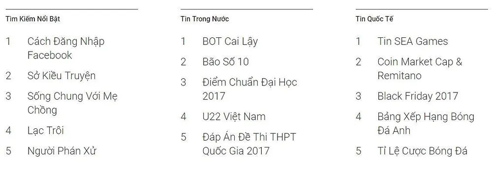 Trong phần tin tức quốc tế được người dùng Việt Nam tìm kiếm nhiều nhất năm 2017 thì từ khóa SEA Games dẫn đầu danh sách. Đủ thấy sức nóng của sự kiện thể thao khu vực diễn ra hồi tháng 8. Tiếp đến là thị trường tiền ảo đang rộ lên trong năm nay. Đứng top 3 của tin tức được tìm kiếm nhiều còn có Black Friday, đánh dấu nhiều sự kiện bán hàng trực tuyến đang làm mưa làm gió trong mấy tháng cuối năm.
