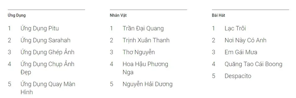 Top 5 ứng dụng, nhân vật, bài hát được người Việt Nam tìm kiếm trên Google năm 2017. (Nguồn: Google)