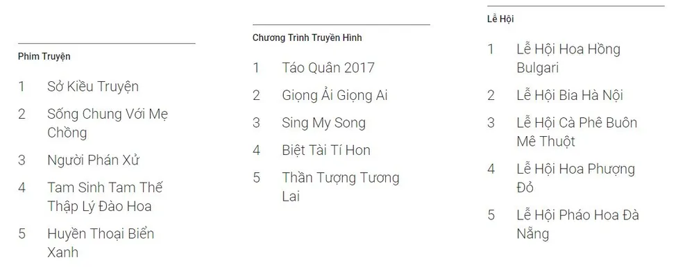 Top 5 phim truyện, chương trình truyền hình và lễ hội được người Việt Nam tìm kiếm trên Google năm 2017. (Nguồn: Google)