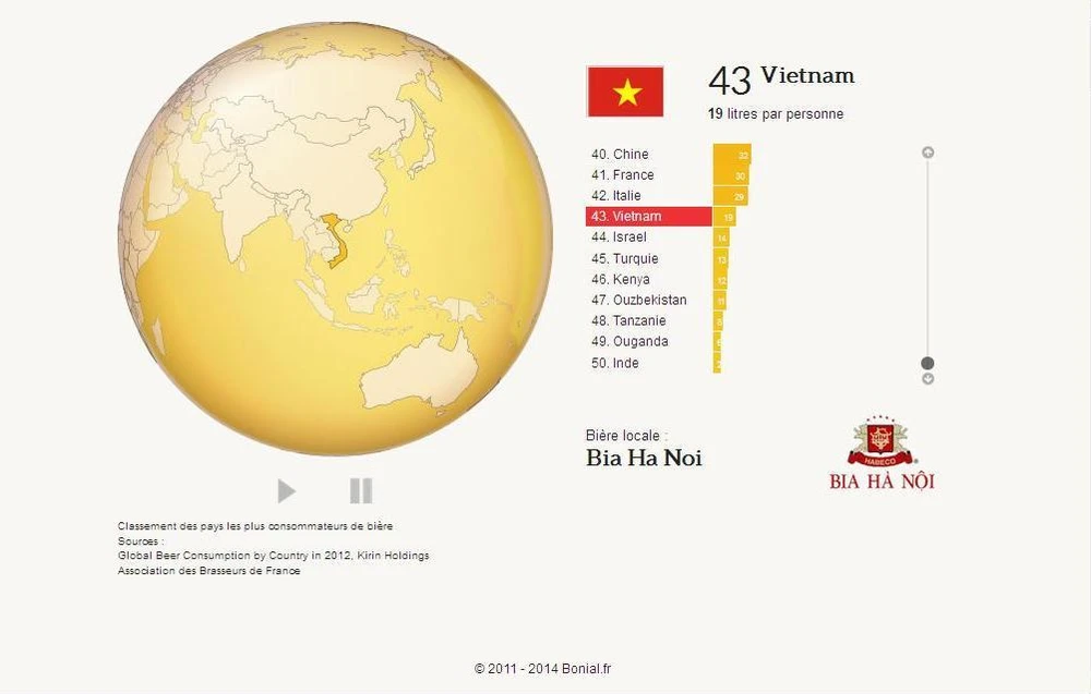 Theo bonial.fr, người Việt Nam tiêu thụ 19 lít bia/ năm, và Việt Nam được xếp thứ 43/50 nước tiêu thụ bia nhiều nhất thế giới. Thương hiệu bia lớn tại Việt Nam là “Bia Hà Nội”