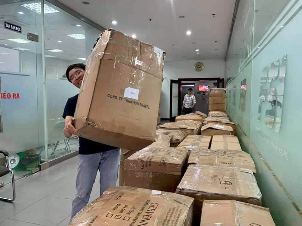 Những thùng hàng nhu yếu phẩm đã được Báo Pháp Luật TP.HCM đóng gói chuyển đến đồng bào các tỉnh bị thiệt hại do mưa lũ. Ảnh: ĐT